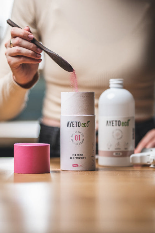 „Udržitelná čistota začíná jednou lahví. S konceptem AYETO Eco už nikdy nebudete muset kupovat nové plastové lahve. Stačí si pořídit naši odolnou doplňovací láhev jen jednou a pak už pouze dokupujete práškové koncentráty, které jednoduše nasypete do lahve, doplníte teplou vodou a můžete začít čistit. Tento systém šetří nejen vaši peněženku, ale i planetu – méně plastového odpadu, méně zbytečných obalů, méně přepravních cest. Jednoduché, ekologické a účinné. S AYETO Eco se udržitelnost stává každodenní součástí vašeho života.“