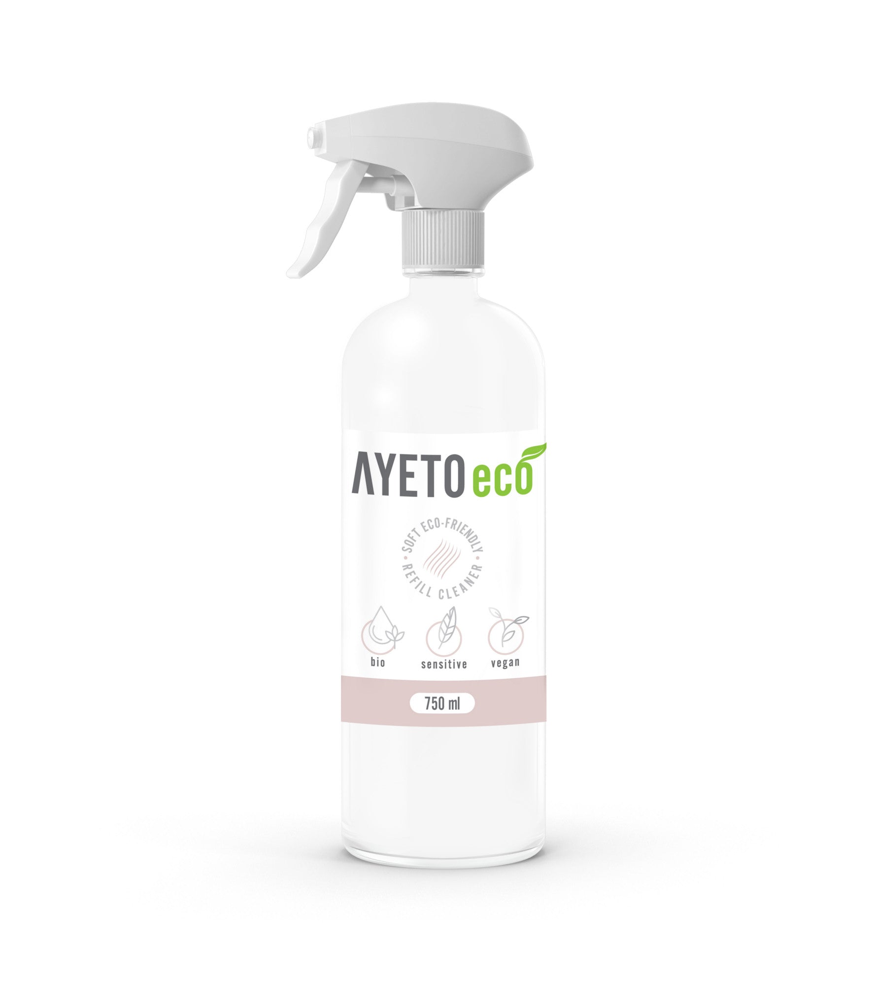 AYETOeco – praktická aplikační prázdná lahev se sprejem o obsahu 750 ml, která je ideální pro přípravu čistícího prostředku z práškových koncentrátů - porcovaných sáčků 20g značky AYETOeco.
